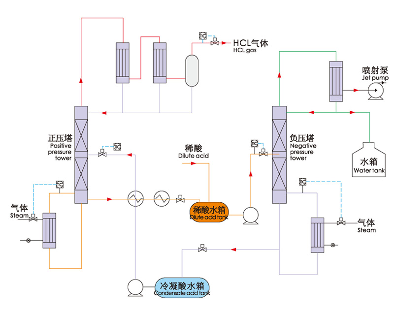 该工艺利用盐酸共沸浓度随压力的变化而变化生产出HCL气体。负压浓缩盐酸正压解吸出HCL气体。但此方法相比萃取法蒸汽耗高,且投资大。