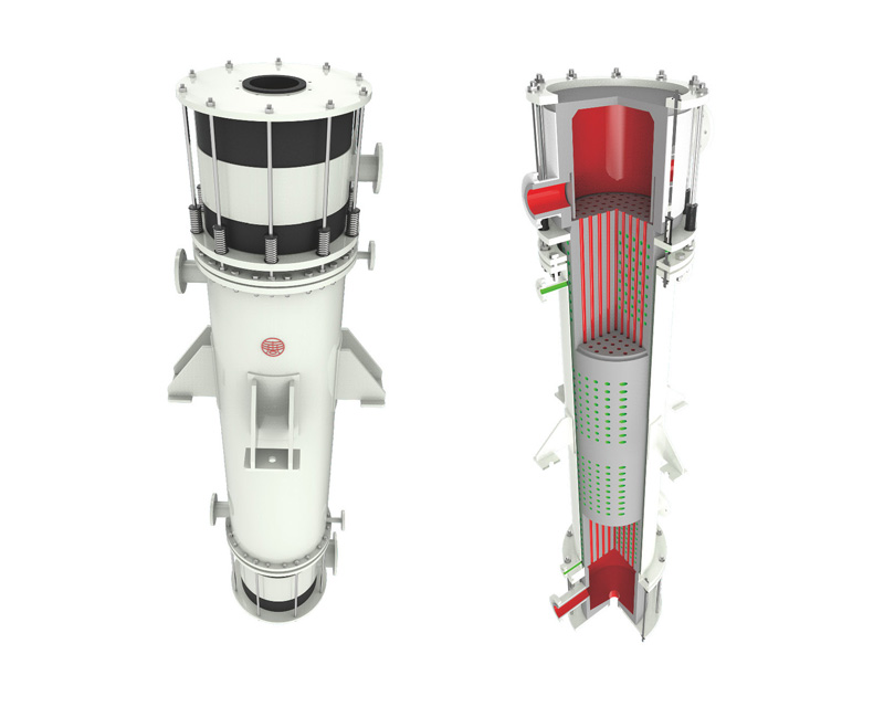 该产品主要由石墨换热块、封头及壳体等组成,采用聚四氟乙烯密封,加装压力弹簧作热胀冷缩自动补偿装置。石墨块上钻有两组不相通的流道,不同流体通过这两组流道达到热交换的目的。该产品根据不同的介质可采用四氟乳液、酚醛、环氧、呋喃树脂等浸渍剂,能满足酸、碱及有机溶剂等工况的使用要求,并具有传热效率高、抗冲击能力强、性能稳定和检修方便等优点,是目前应用于蒸发、加热、冷却及冷凝等装置的理想设备。